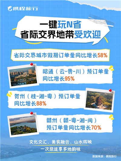 在寶貴的假期,旅客非常重視時(shí)間利用效率,能夠一次性體驗(yàn)多個(gè)省份風(fēng)情的省際交界城市,成為今年國(guó)慶的熱門選擇。攜程數(shù)據(jù)顯示,截至目前,國(guó)內(nèi)省際交界城市的假期訂單量同比增長(zhǎng)58%。其中,融合了云、貴、川三省民族風(fēng)情與自然景觀的昭通假期預(yù)訂單量同比增長(zhǎng)95%;處于桂、湘、粵交界的賀州以喀斯特地貌與古鎮(zhèn)文化聞名,訂單量同比已增長(zhǎng)88%;位于贛、粵、湘、閩四省交界的贛州訂單量同比增長(zhǎng)70%,其客家文化與紅色歷史吸引大量游客。