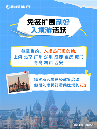 值得注意的是,近期中俄互相免簽政策推動(dòng)俄羅斯游客來(lái)華熱情上升。截至目前,本次假期俄羅斯旅客入境預(yù)訂量同比增長(zhǎng)75%,游客偏好的目的地包括北京、上海、三亞、廣州、哈爾濱等。