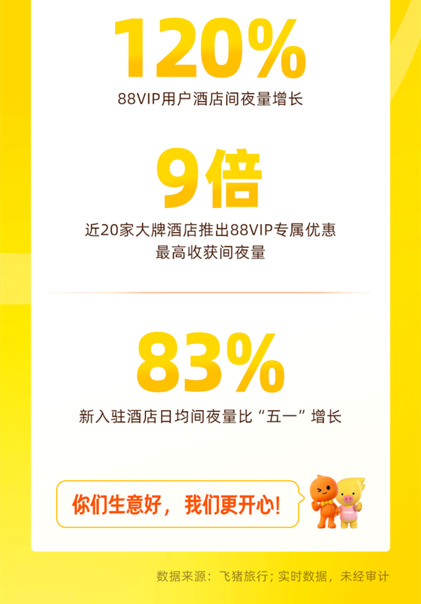 以88VIP為例,10月1日至10月8日期間,88VIP用戶為酒店帶來的間夜量增長了120%,且人均消費保持上揚態(tài)勢。與此同時,今年“十一”,近20家大牌酒店與飛豬深度合作,為88VIP提供專屬優(yōu)惠及多種出游權益,讓會員無需比價,放心下單。截至10月8日,這些酒店來自88VIP用戶的間夜量同比去年全部翻倍,最高增長可達9倍。