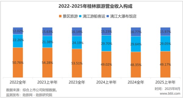 上半年,桂林旅游主營業(yè)務(wù)中,景區(qū)旅游,漓江游船客運,漓江大瀑布飯店營業(yè)收入占比分別為49.17%、29.05%、15.97%。