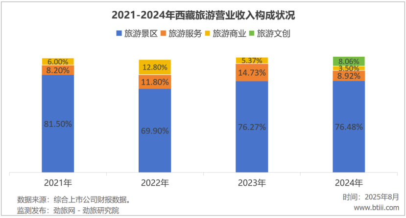 2024年,西藏旅游主營(yíng)業(yè)務(wù)中,旅游景區(qū)、旅游服務(wù)、旅游商業(yè)、旅游文創(chuàng)營(yíng)業(yè)收入占比分別為76.48%、8.92%、3.50%、8.06%。