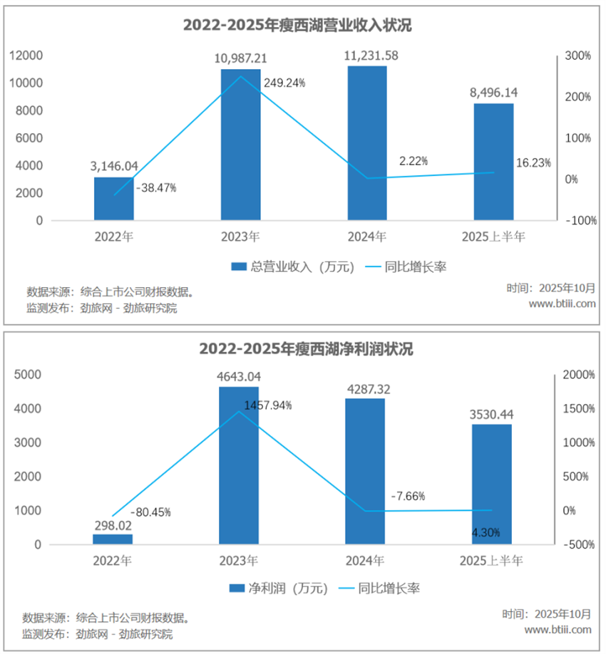 根據(jù)資料,瘦西湖2025年上半年實現(xiàn)營業(yè)收入8496.14萬元,同比增長16.23%。歸屬于上市公司股東的凈利潤3530.44萬元,同比增長4.30%。