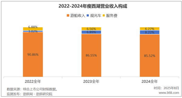 2024年,瘦西湖主營業(yè)務(wù)中,游船業(yè)務(wù)、觀光車業(yè)務(wù)、服務(wù)費分別占營業(yè)收入85.52%、8.22%、6.27%。