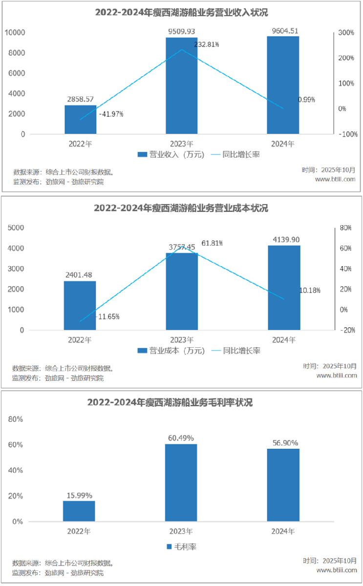 其中,游船業(yè)務(wù)實現(xiàn)營業(yè)收入為9604.51萬元,同比增長0.99%。營業(yè)成本為4139.90萬元,同比增長10.18%。毛利率為56.90%,比上年下降3.59個百分點。
